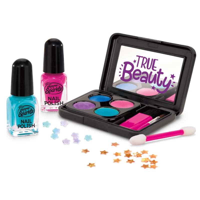 Комплектація: 4 відтінки помади, 4 відтінки тіней для повік, 4 відтінки блиску для губ, 2 відтінки рум’ян, 3 лаки для нігтів, 2 листи наклейок для нігтів, 42 клейкі наклейки для нігтів.