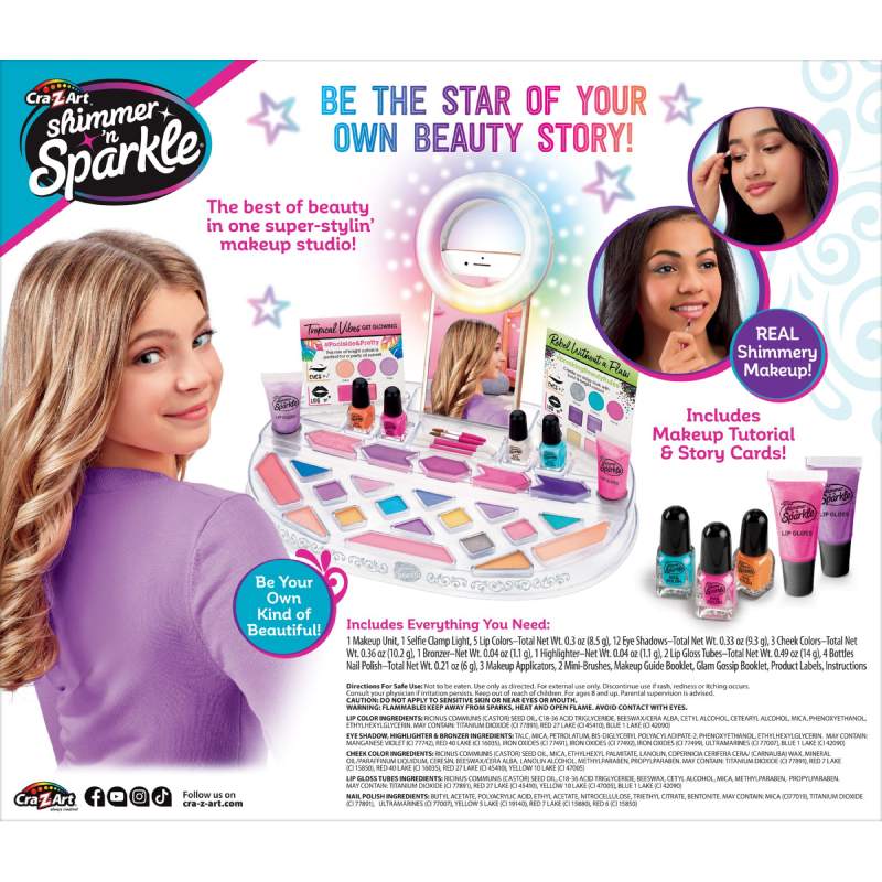 Набір дитячої косметики Cra-Z-Art Selfie Time Light Up Beauty Studio являє собою студію декоративного макіяжу з дзеркалом і підсвічуванням. Конструкція студії містить світлове дзеркало, кліп-лампу для селфі та тримач для телефону. Палітра включає відтінки для очей, губ і щік, а також додаткові засоби для декоративного оформлення образу. Формат студії поєднує косметичні елементи, аксесуари для макіяжу та освітлення для створення фото або відео під час гри.