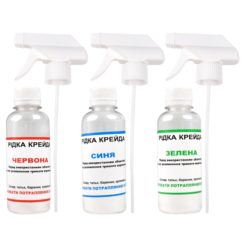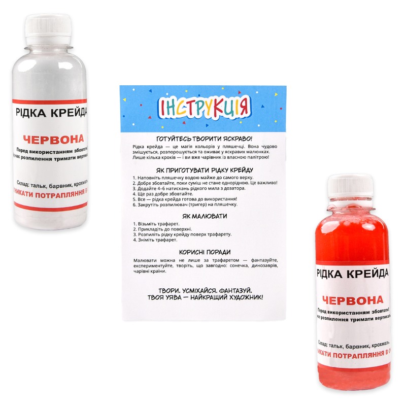 Комплектація: пляшки з сумішшю — 3 шт., інструкція — 1 шт., зіп-пакет — 1 шт. крейда — 5 шт., тригер — 3 шт., трафарети — 6 шт.