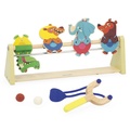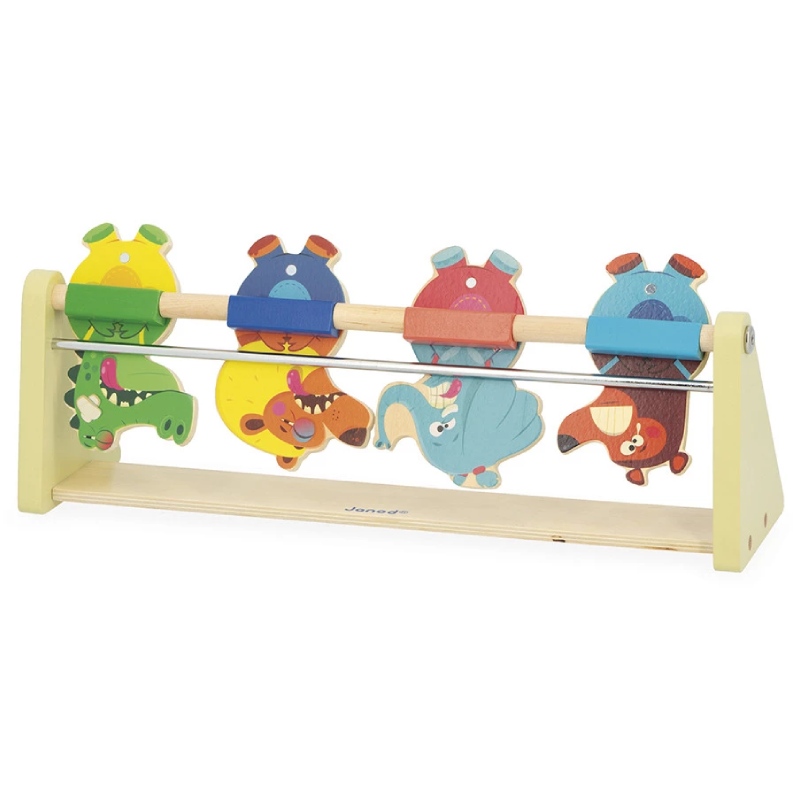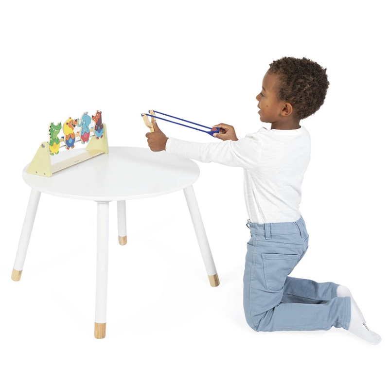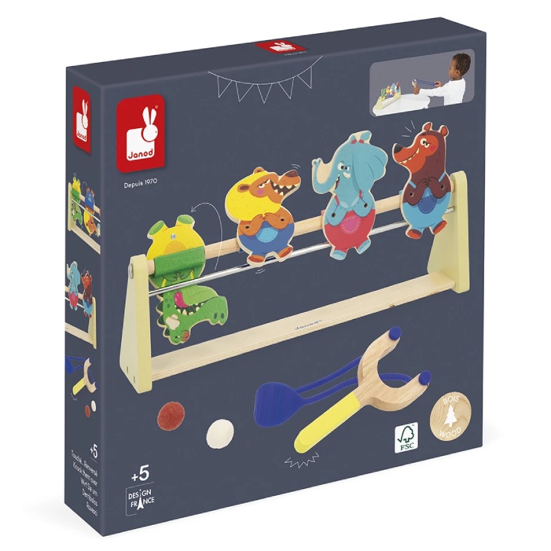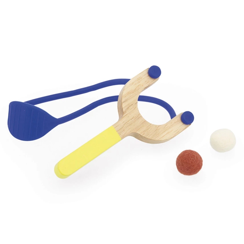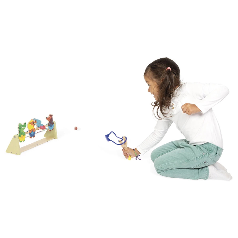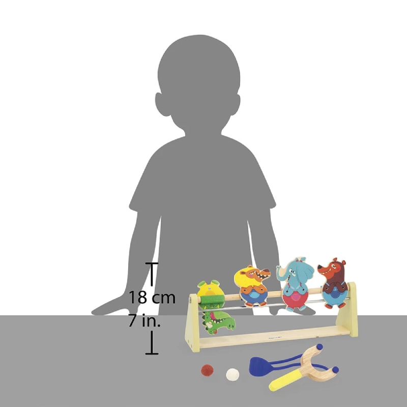 Гра для розвитку концентрації, вміння та координації. Вам потрібно адаптувати відстань між запускачем і мішенями, щоб відповідати різним рівням складності. Запускач у формі рогатки та динго-тварини, що складають цю гру, запрошують до виклику! Персонажі стоять вгору ногами завдяки системі магнітів і мають висоту 11 см. Ця дерев’яна гра на вміння постачається з 2 м’ячами.