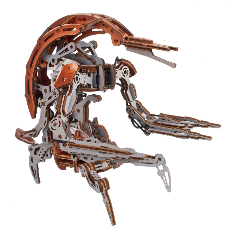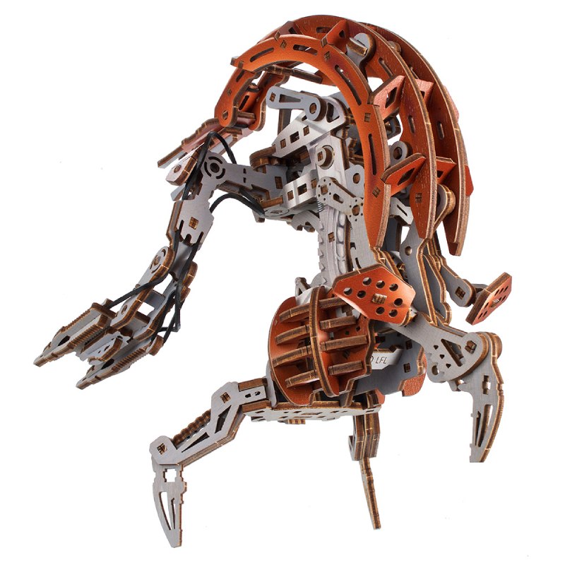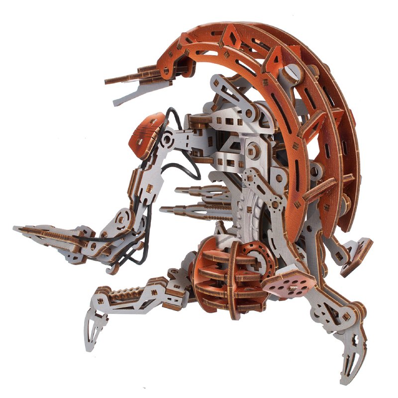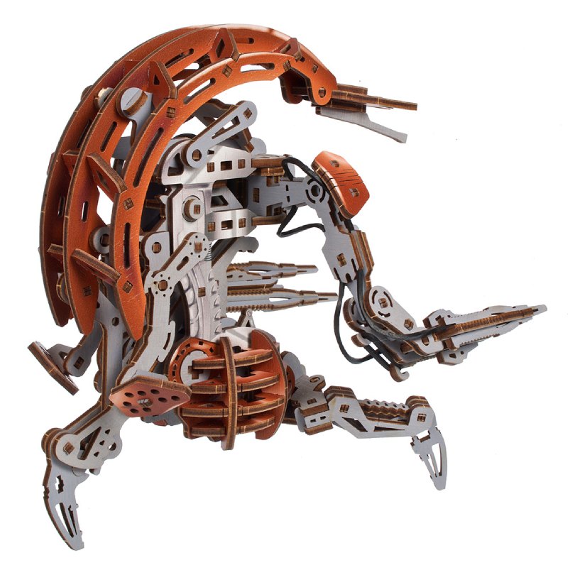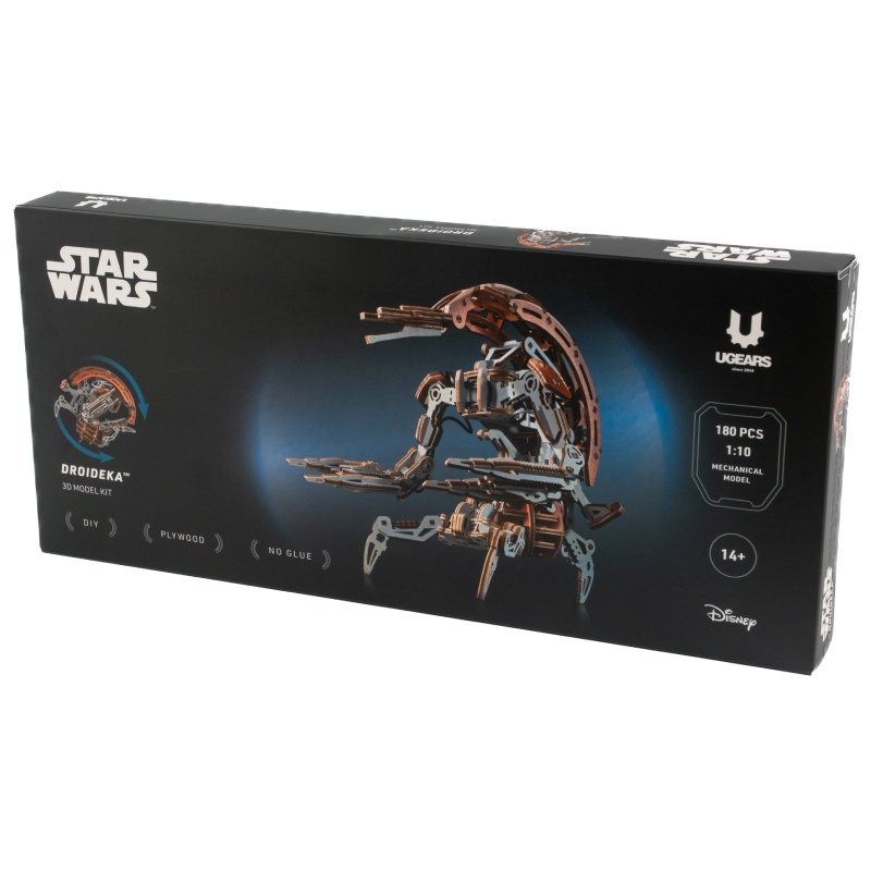 Дерев'яний 3D-конструктор Дроїдека від Ugears відтворює цю знакову трансформацію сфери в бойового дроїда за допомогою унікальної системи гумових важелів. Склади модель вручну у сферу, а потім відпусти — і вона миттєво розгорнеться у бойову стійку, точно як у фільмах. Руки-бластери можна складати й розгортати незалежно одна від одної. Модель пропонує два режими запуску: просто підніми над столом і відпусти для гарантованої активації або ж зафіксуй механізм і покоти, щоб активація виглядала ще більш видовищною.