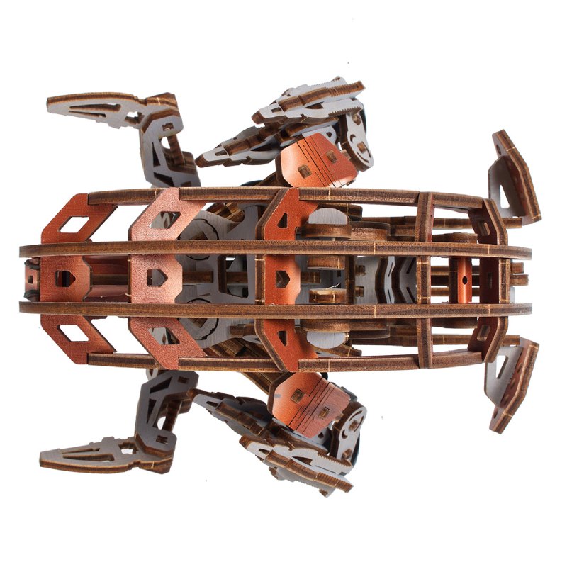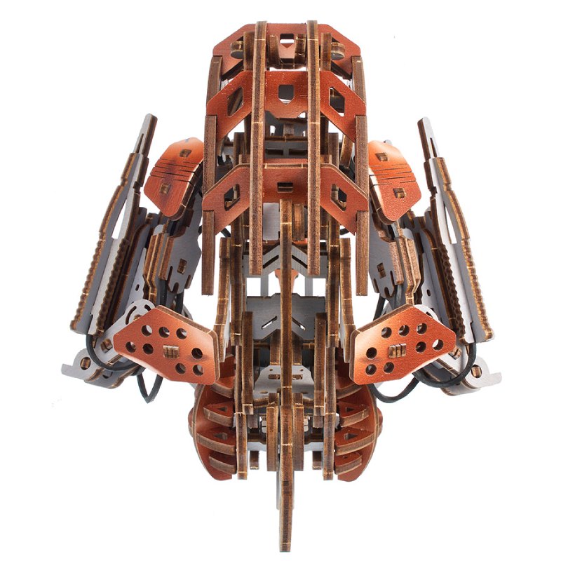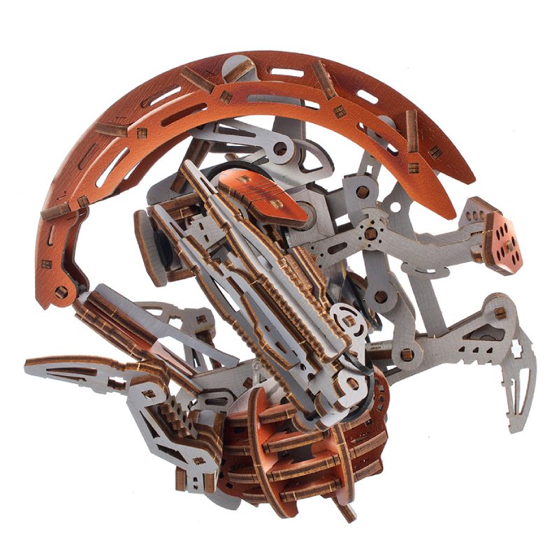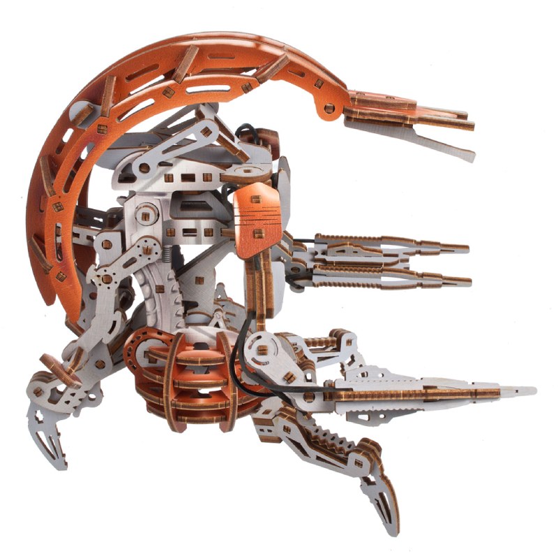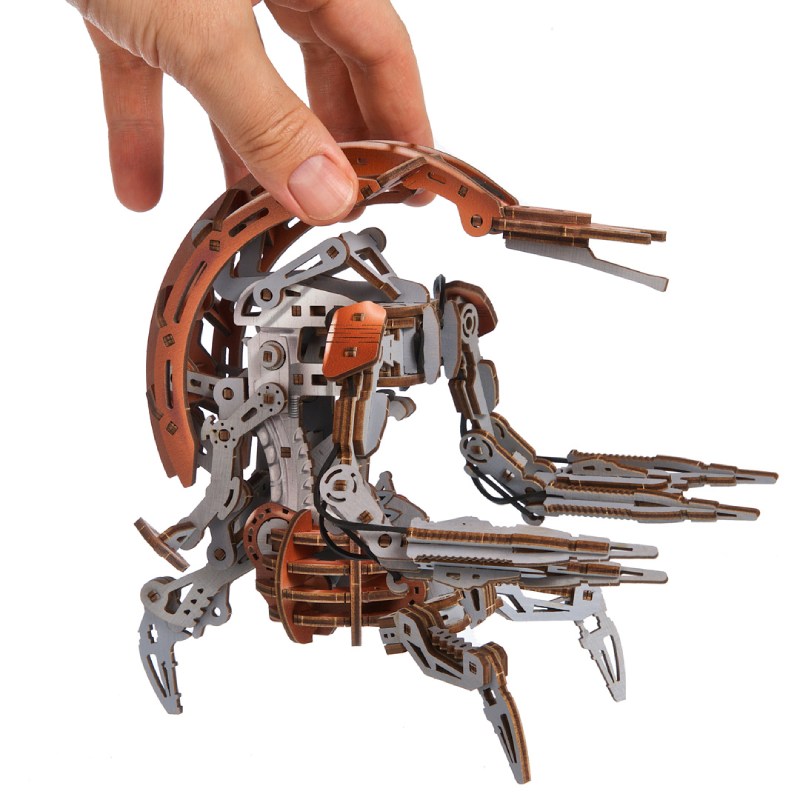 Дерев'яний 3D-конструктор Дроїдека від Ugears відтворює цю знакову трансформацію сфери в бойового дроїда за допомогою унікальної системи гумових важелів. Склади модель вручну у сферу, а потім відпусти — і вона миттєво розгорнеться у бойову стійку, точно як у фільмах. Руки-бластери можна складати й розгортати незалежно одна від одної. Модель пропонує два режими запуску: просто підніми над столом і відпусти для гарантованої активації або ж зафіксуй механізм і покоти, щоб активація виглядала ще більш видовищною.