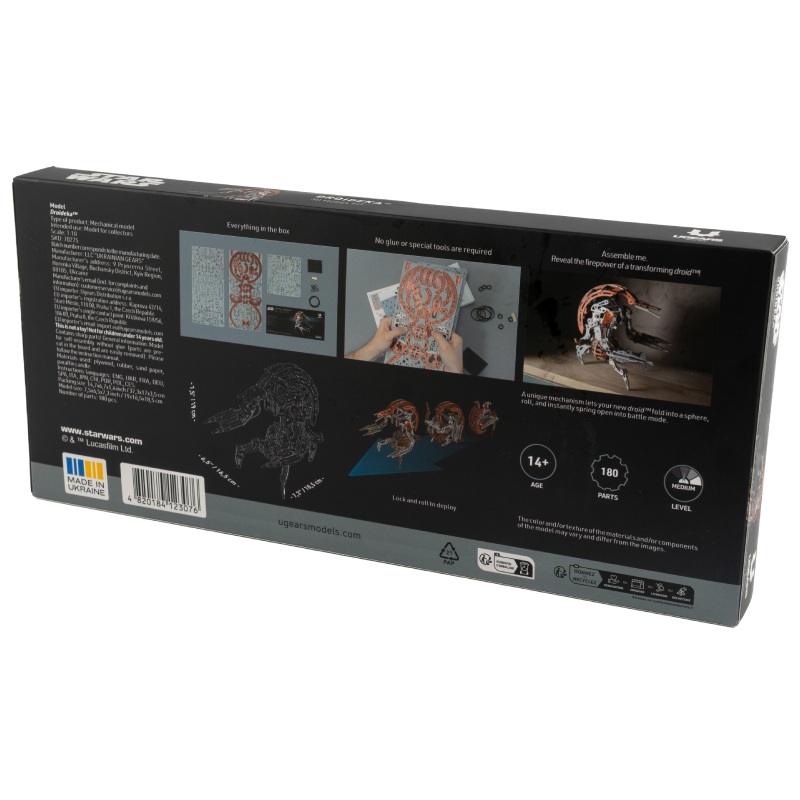 Створи власноруч модель невблаганного дроїда-руйнівника з ліцензованої серії Ugears, натхненної культовою сагою Зоряні війни™, – Дроїдеку. Відомий своєю здатністю складатися у компактну сферу й миттєво розгортатися в бойовий режим, Дроїдека служив Торговій федерації, а згодом Конфедерації незалежних систем під час Війн клонів. На екрані ці грізні дроїди поєднували високу мобільність, шквальний бластерний вогонь і надзвичайно міцні щити-відбивачі, що робило їх одними з найнебезпечніших бійців у арсеналі Сепаратистів. З подвійними бластерними гарматами, обертовою «головою» та впізнаваним силуетом цей бойовий дроїд наводив жах як на клонів, так і на джедаїв.
