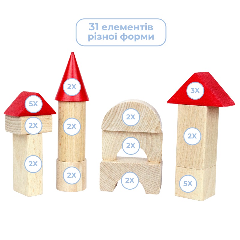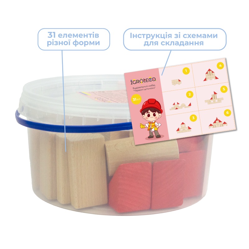 У комплекті є інструкція з готовими варіантами будівель, але дитина завжди може вигадувати власні споруди – від маленького будиночка до справжньої фортеці. Це чудова розвивальна іграшка з дерева, яка перетворює гру на творчий процес.