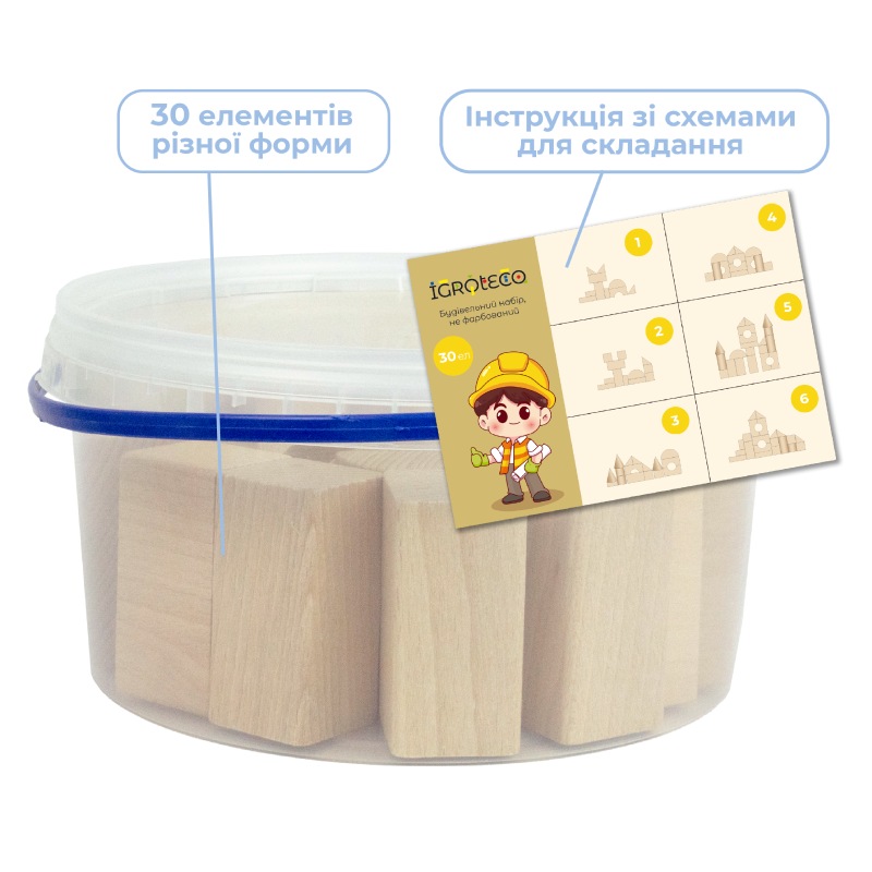 Цей набір виготовлений із натурального дерева без фарбування, тож він абсолютно безпечний для малюка. А зручне відеречко допоможе зберігати кубики в порядку та брати їх у гості чи подорож.