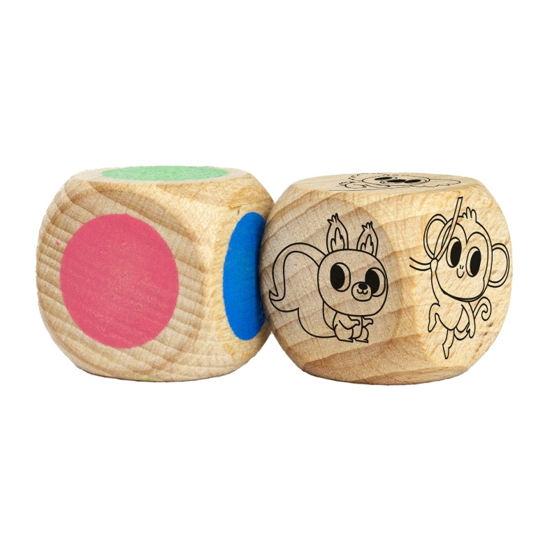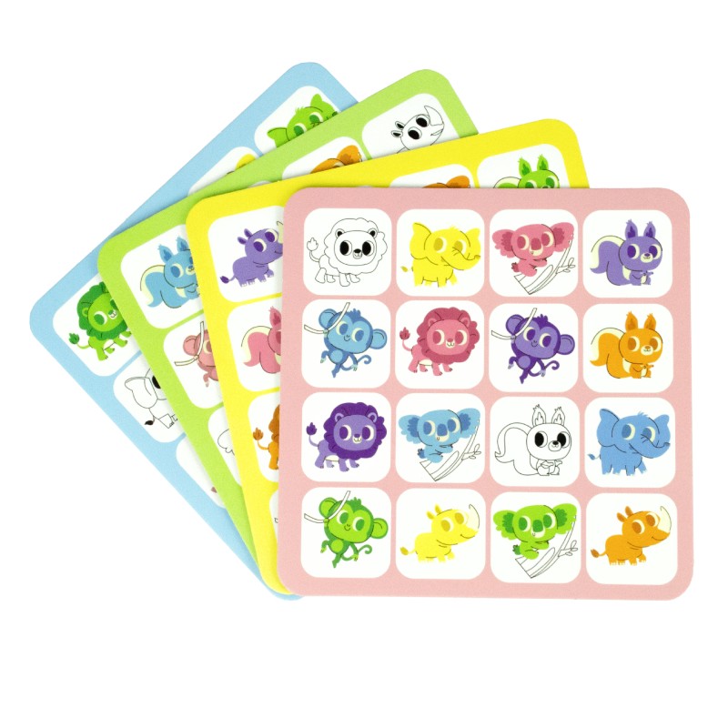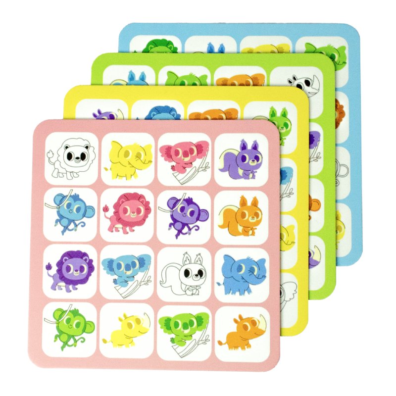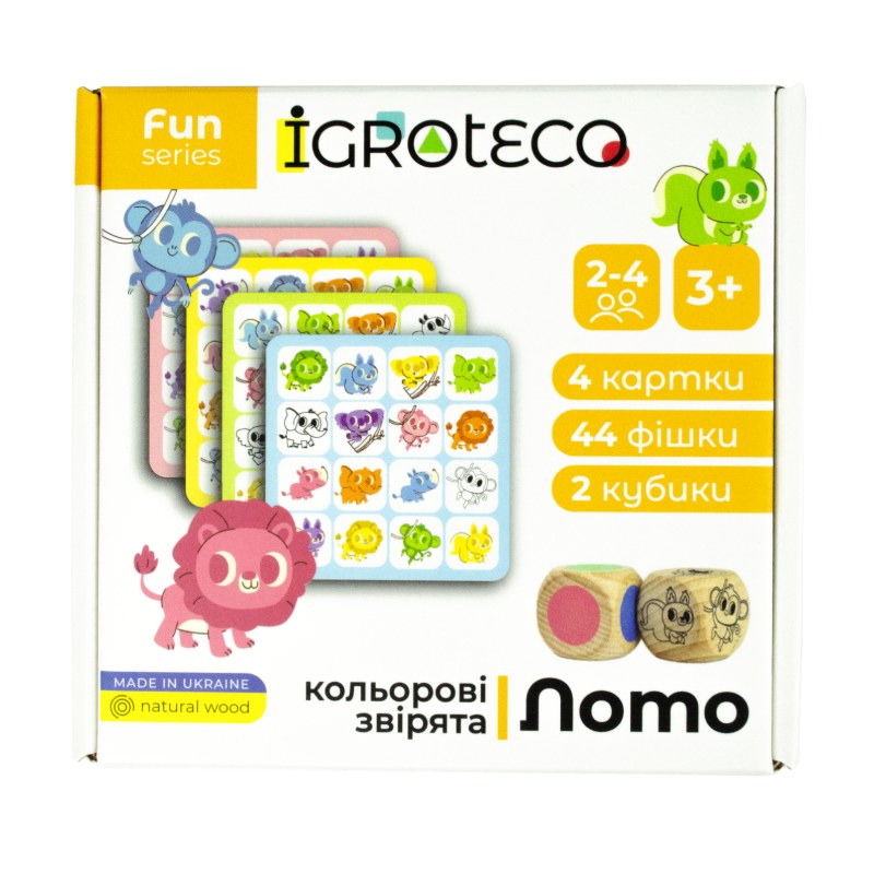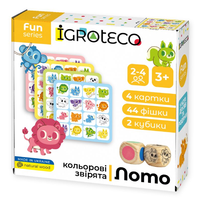 У наборі — 4 картонні гральні поля 4х4, 44 фішки, дерев’яний кубик із кольорами та ще один кубик зі звірятами.