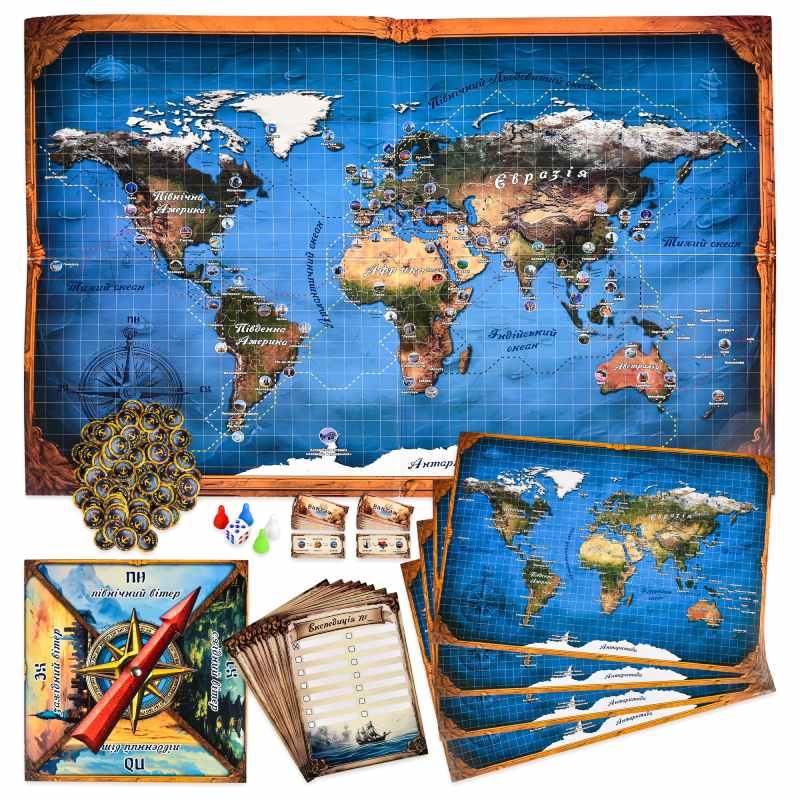 Комплектація: коробка (виготовлена з картону), ігрове поле — 1 шт., кубик, фішки — 4 шт., інструкція, рулетка, призові жетони — 75 шт., навігаційні карти — 4 шт., картки «Вантаж» — 56 шт., експедиційні листи — 8 шт., картки «Прапори світу» — 110 шт.