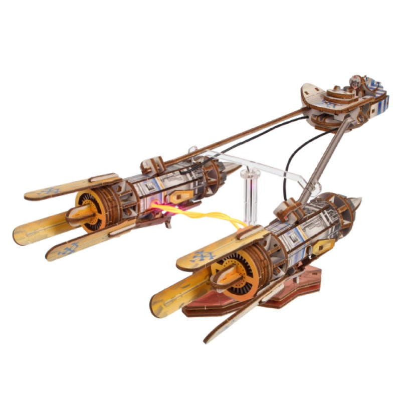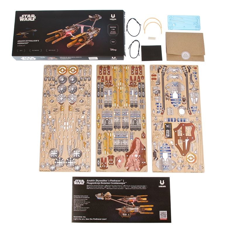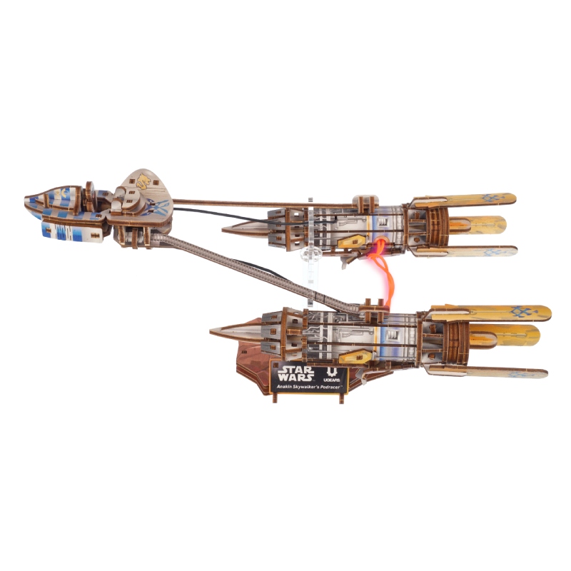 Подрейсер Енакіна Скайвокера від Ugears передає азарт перегонів завдяки унікальному балансному механізму, що дозволяє моделі нахилятися, погойдуватися та обертатися, імітуючи політ у режимі зависання. У кабіні сидить Енакін Скайвокер, а бокові дверцята відчиняються та зачиняються. Двигуни з’єднані гнучкими LED-дротами на батарейці, що створюють фірмовий ефект електричної дуги, як у фільмі. Щоб запалити світло, достатньо перемкнути вимикач, розташований під двигунами, — і дуга оживе. Розрядилася батарейка? Не проблема: тримач батарейки легко виймається з корпусу для швидкої заміни.