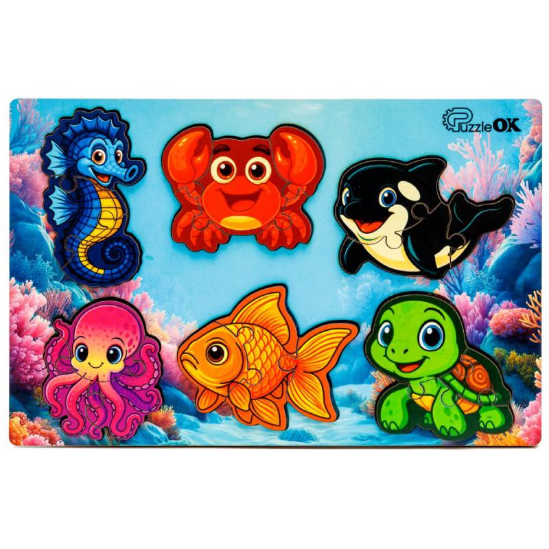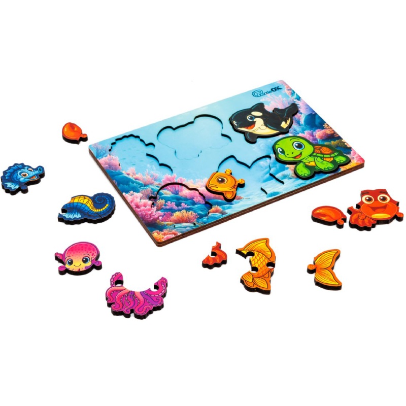 Розвиваючий дерев'яний сортер PuzzleOK «Розумний світ. Морські друзі» у форматі A5 — чудовий вибір для дітей від 3 років. Цей яскравий пазл-вкладиш містить 18 елементів, створених для того, щоб гра перетворювалася на навчання: дитина вивчає форми, кольори та морських мешканців, одночасно розвиваючи дрібну моторику, логічне мислення та увагу.